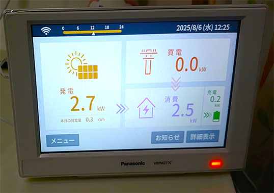モニターで今の電気使用量が分かるようになり、自家発電で少しでも無駄なエネルギー削減ができていると思います。